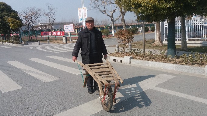 2月8日,習近平總書記參觀淮海戰役紀念館時提到的小推車出現在緊臨淮海的六垛集市上。小推車擁有者是淮海三分場社區的退休干部徐傳友。