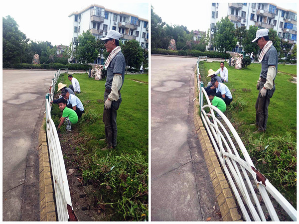 8月22日下午5點(diǎn),在新洋農(nóng)場(chǎng)有限公司機(jī)關(guān)大樓門(mén)前的草地上,幾名綠化工正在拔里面的雜草,他們當(dāng)中,一個(gè)穿綠衣服、看上去四五歲的小男孩吸引了路人的注意。
