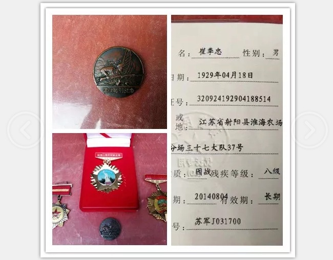 1929年出生的崔季忠今年已經90歲,崔季忠老人最先在許世友將軍轄區的12縱隊,老人跟了許世友將軍3年,在鹽城劉莊戰役三進三出中就有崔季忠的身影,戰役最終只有老人和其他兩位戰友幸存下來,但他們整個部隊在只剩3個人的情況下,仍然抓獲了40多名俘虜。崔季忠的嘴是在淮海戰役中攻打濟南時受的傷,并被炮彈打掉了3顆牙齒,負傷后轉到六分區訓練新兵,后又轉到102師參加渡江戰役,直接打到上海。之后他又修整了3個月,最后參與了解放崇明戰爭,并在1952年到淮海農場參與建設。