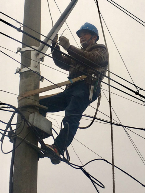 楊超元立即向中心主任匯報了情況。電管中心許小靜主任得到消息后,一邊到庫房拿取材料,一邊打電話給夏建忠電工趕來援助。5分鐘后,三位在停電現場分工合作,拉線、布線、接線。夜色越發變黑,高聳的電桿冷冰冰地伸向黝黑夜空。楊超元用嘴咬著應急燈,爬桿、接線。凜冽的寒風像刀一樣吹刮著他的臉,作業的手被冰得麻木了,平時幾分鐘就能弄好的接線,他在10余米的電桿上整整花費了15分鐘。經過2個小時的奮戰,他們為該小區臨時架設了50米的線路,在22點恢復了供電。