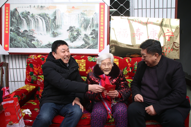山中難尋千年樹,世上難得百歲人。2月15日,董懷秀老人喜迎百歲壽辰。當天,新洋農場有限公司副總經理王煜明以及射陽縣民政局主任楊為宏等一行共同前往老人家中為老人祝壽,分別送上慰問金和牌匾,真心祝愿老人福壽安康。