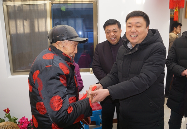 2月16日,新洋再添一喜,老人李永平同樣喜迎百歲壽辰。上午,王煜明、楊為宏一行親臨老人家中,為老人送去賀壽金、兩幅賀壽的字畫,與老人拉家常,關切地詢問他的身體狀況和生活起居情況,并祝他健康永相隨。