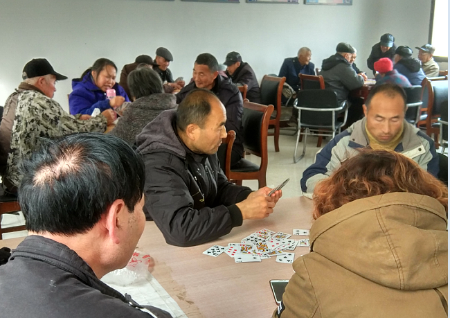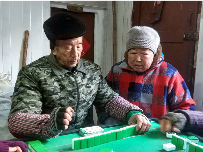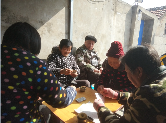 在陽光融融的午后,我們經(jīng)常可以看到有好幾撥老年人圍坐在各個屋墻前或是廚房客廳里,打著爭紅旗、爭上游、摜蛋等牌類游戲。有興趣了老年人還天天聚在固定的地方打上幾圈麻將。雖然他們都是些七八十歲的老年人了,但看著他們的神情是那么地滿足,在相互游戲中頤養(yǎng)著天年。