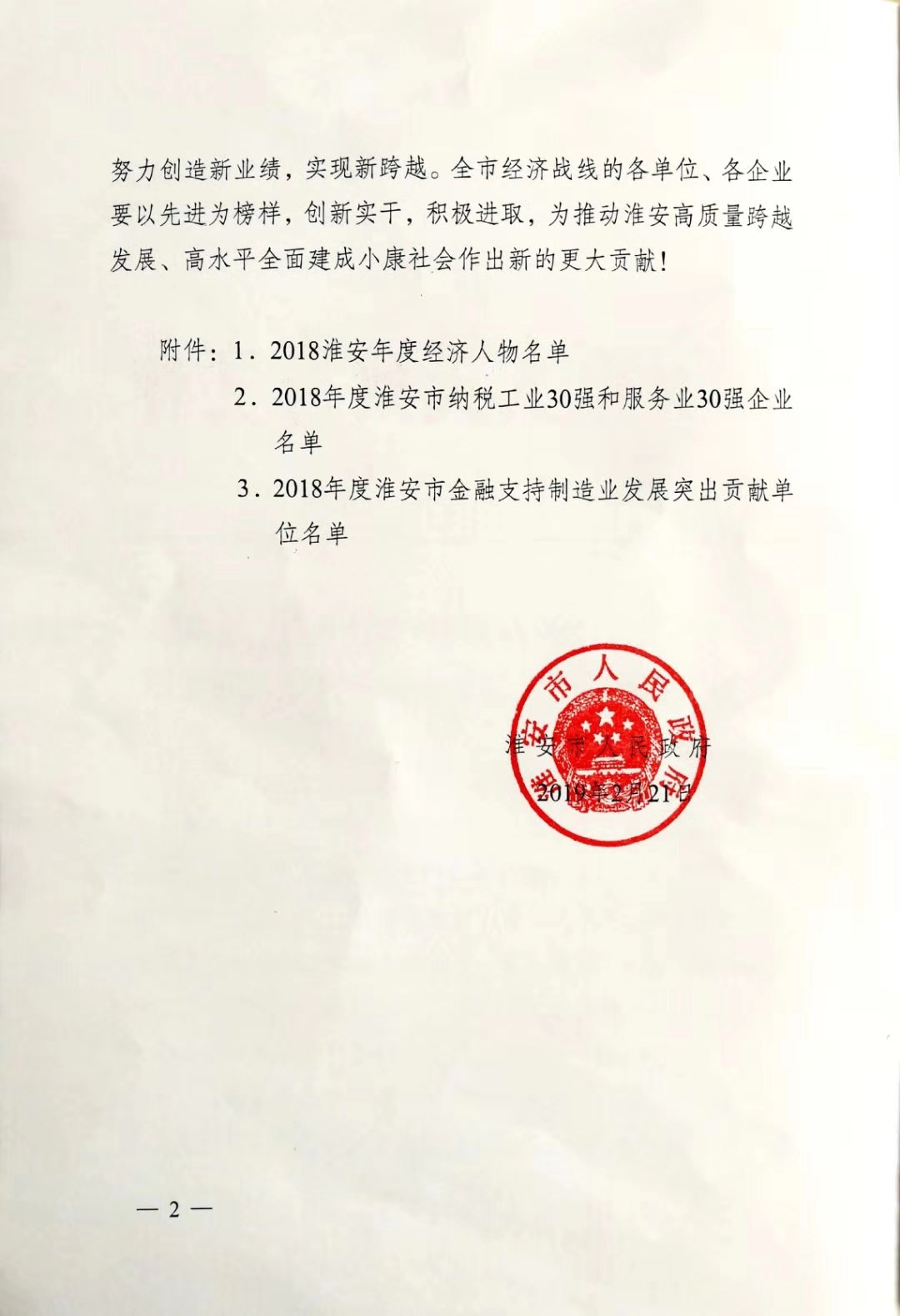 為表彰先進、樹立標桿、促進淮安地方經濟邁向高質量發展行列,近日,由淮安市人民政府發起和組織開展的“淮安經濟人物、淮安市納稅工業30強和服務業30強企業、淮安市金融支持制造業發展突出貢獻單位“評選活動在淮揭曉并正式向社會發布,正大清江制藥以年納稅額超億元榮登2018年“淮安市納稅工業30強企業”第15位,至此正大清江制藥已連續兩年躋身“市納稅工業三十強企業”行列。