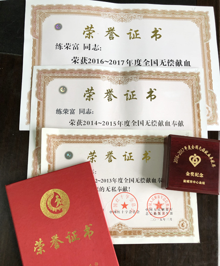 1999年4月,東臺市開展無償獻血工作時練榮富就帶頭報了名,從此他與無償獻血結下了不解之緣,一堅持就是20年,20年來,他堅持每年獻血兩次,如今獻血總量已達9200毫升,是他全身血液的2倍半。如果按救助一個病人平均需要800毫升血液計算,他所獻的血已能救活十多個病人。在他的帶動下,農場供電服務公司職工每年都堅持無償獻血,供電服務公司黨支部書記繆龍順獲2016~2017年度全國無償獻血奉獻獎銀獎,線路班班長張如海獲2014~2015年度全國無償獻血奉獻銅獎。