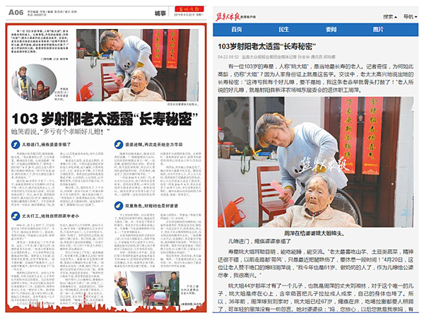 這是一個四世同堂的大家庭,報紙中的百歲老人名叫“姚大姐”,今年103歲高齡,耳聰目明,能吃能睡,能交流,見人就愛講述她的長壽秘密:“這得虧我有個好兒媳,要不是她,我這條老命早就骨頭打鼓了!”