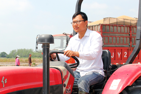 中午,工人們已下班,路過秧池,劉中現發現有些秧苗在正午的太陽下出現卷葉的現象,他連忙拉開進水口往田里上水,30多個秧池全部轉上一圈,得花上2個小時。為了方便工作,來了第八生產區擔任技術員時,劉中現就自費考取了了拖拉機駕駛證。只見他走過場頭,拿起水份儀測了一下,便發動場邊的翻場機,將下午要打囤的麥子來回翻了一遍,麥浪翻滾劃出優美的弧線。水稻栽后要施肥,他嫻熟地駕駛拖拉機裝肥料運到田頭,與工人們一起拆袋往拋肥機里裝,幾年來的農業生產管理不但豐富了農技知識,更鍛煉出他強壯的體魄。