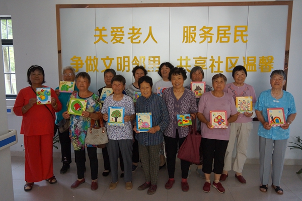 創(chuàng)作完后,老人們紛紛用自己的作品和工作人員一起裝扮起服務(wù)中心,五顏六色的創(chuàng)意貼畫,為這炎熱的夏天又增加了一抹色彩。