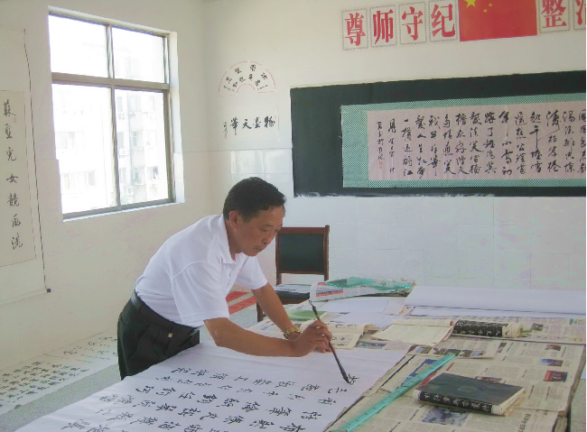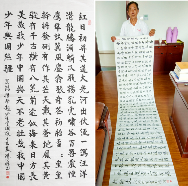 所悉,陳必祥無論在教學(xué)中還是平時(shí)的休閑時(shí)間,多年來一直潛心研究書法藝術(shù),是中國書畫家協(xié)會(huì)理事,作品多次獲得國家和省、市、縣大獎(jiǎng)。每次農(nóng)場(chǎng)公司書畫書法協(xié)會(huì)組織作品展示時(shí),他都要寫出幾張作品應(yīng)征。圖為陳必祥在展示書法和作者近照。