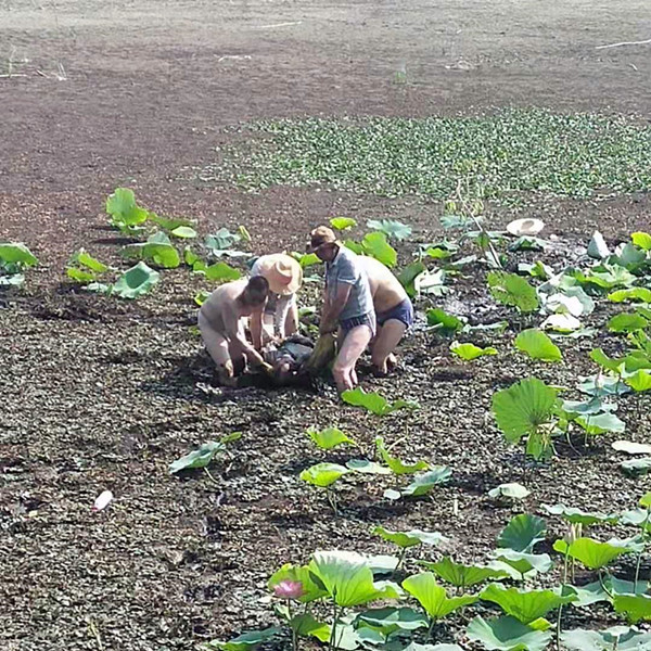 被救老人叫吳殿高,今年78歲,家住淮河化工廠,早上與幾個同伴一起到洪澤湖荷花蕩采摘蓮子,由于天氣炎熱,其他的同伴采摘了一會便相繼回了家,只有老人一人還在湖里繼續(xù)采摘,不知不覺老人就采到了荷花蕩深處,淤泥也越陷越深一直沒到了老人腹部,想要再拔腿往回走,腿已經(jīng)深深的陷進(jìn)淤泥怎么也拔不出來,氣溫越來越高,加之老人已年近80,漸漸沒有力氣,老人只能陷在荷花蕩里,慢慢失去了知覺,正在他逐漸失去意識時, 忽然聽見岸邊有人和他說話,老人才拼命的抬起頭說了一句話,從陷進(jìn)淤泥到被上岸,老人已在被困近兩個小時。
