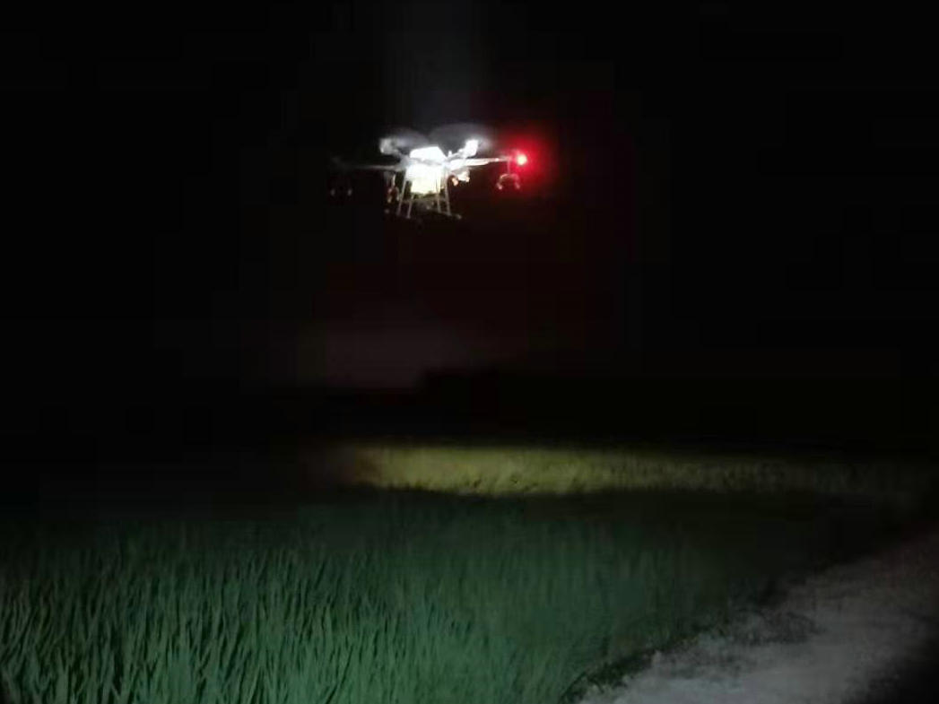 7月25日夜晚,寶應湖分公司共和生產區水稻田里,點點紅光閃爍,與熒火蟲共舞,原來是植保飛機正在給稻田噴灑藥物。