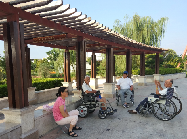 “現(xiàn)在生活條件好了,淮海公園中的環(huán)境和設(shè)施讓殘疾人也有了運(yùn)動(dòng)之地,我們幾個(gè)八九十歲的老人雖然腿腳不便,但大家有共同語言,每天在公園內(nèi)玩得很好,還一起相互鼓勵(lì)進(jìn)行環(huán)公園輪椅賽哩!”在淮海公園的長廊下,行走不便的朱大爺坐在輪椅車上很是興奮,志趣相投的三位老人聊天結(jié)束后,就會(huì)來一場“說走就走”的步行賽,雖然朱大爺坐的是一輛電動(dòng)的輪椅車,但他還是與他們一起,徒步推著殘疾車向前奔跑。