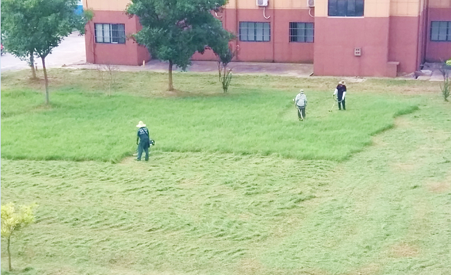 一頂草帽,一幅太陽(yáng)鏡,一身厚布衣服,一雙解放鞋,肩上背著沉重的剪草機(jī),兩眼凝視著地面,雙手緊握操作手柄,隨著腰部的不停旋轉(zhuǎn),濃烈的汽油尾氣和飛濺草腥味不時(shí)撲入鼻中,這是我對(duì)他們專心工作時(shí)的印象。