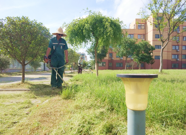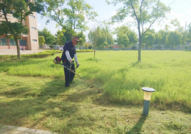 而在農(nóng)場(chǎng)公司公園中、路邊公園里或是小區(qū)、辦公場(chǎng)所里,不時(shí)響起的馬達(dá)轟鳴聲,仿佛在與高溫一起轟鳴。循聲望去,只見三位淮海綠化環(huán)衛(wèi)所的職工正頂著烈日,揮汗如雨地在修剪草坪。