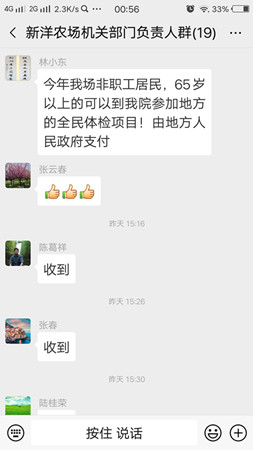 9月10日中午,新洋農(nóng)場醫(yī)院院長林小東在公司負責人群里分享了一則喜訊,“今年我場非職工居民,65歲以上的可以到農(nóng)場醫(yī)院參加地方的全民體檢項目,由地方人民政府支付。”標志著經(jīng)過一年多的積極對接,農(nóng)場公司終于爭取到部分人員全民健康體檢均等惠民政策,提高了居民群眾的幸福感和滿意度。消息傳出后,在全場范圍內(nèi)起了很大反響。