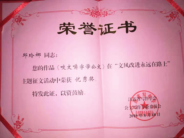 三是改進文風。公司一方面嚴格審核發文規格、發文程序和發文報送范圍,認真執行公文處理有關規定,從嚴審批,規范簽發,改進文風,轉變作風。另一方面,堅持問題導向,開展“公文找茬”活動,通過對身邊公文找差錯形式加強印象,從而提高學習成效。近日,農場職工撰寫的作品《咬文嚼字學公文》在江蘇省寫作協會公文專委會舉辦的“文風改進永遠在路上”主題征文活動中榮獲優秀獎。