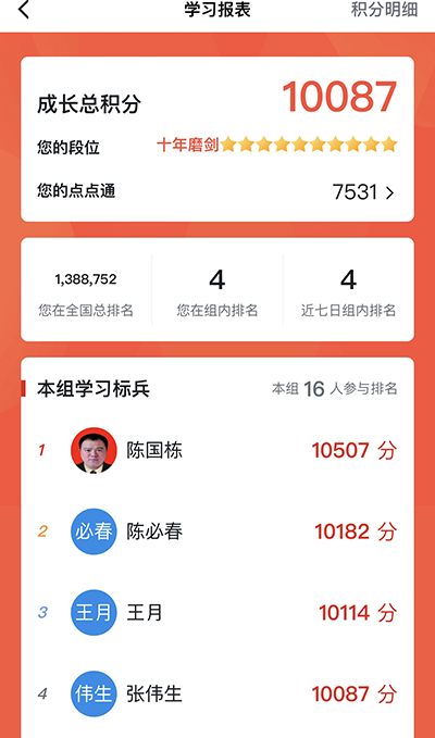 強(qiáng)化定期考核。該公司黨委組織學(xué)習(xí)強(qiáng)國(guó)管理員根據(jù)當(dāng)日參與學(xué)習(xí)人數(shù)、累計(jì)積分?jǐn)?shù)進(jìn)行核實(shí)匯總,一天一通報(bào)、一周一考核,定期通報(bào)“學(xué)習(xí)強(qiáng)國(guó)”學(xué)習(xí)的整體情況,保證“學(xué)習(xí)強(qiáng)國(guó)”學(xué)習(xí)善始善終,黨員干部覆蓋率100%。