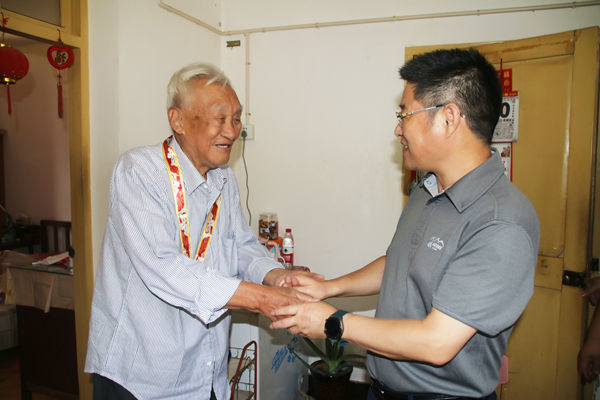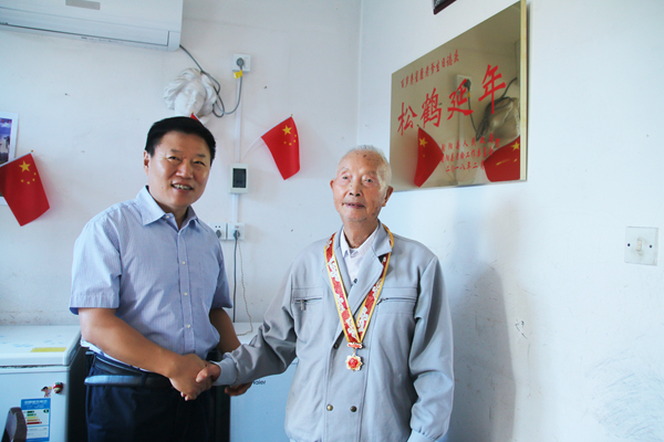 黨委書記陳守軍來到101歲的糜享祥老人家中,緊緊握著老人的手,感謝地說:“如果沒有像糜老這樣老一輩的努力奮斗,就沒有祖國的繁榮富強,更沒有我們如今的幸福生活!”并親自為糜老戴上了紀念章,仔細為老人講解紀念章的深刻含義,與百歲老壽星合影留念。