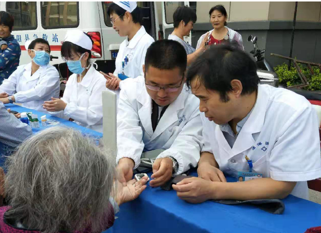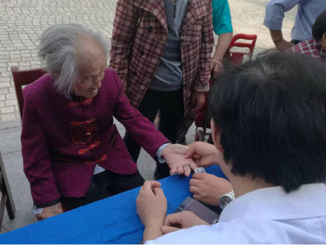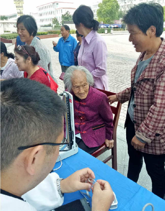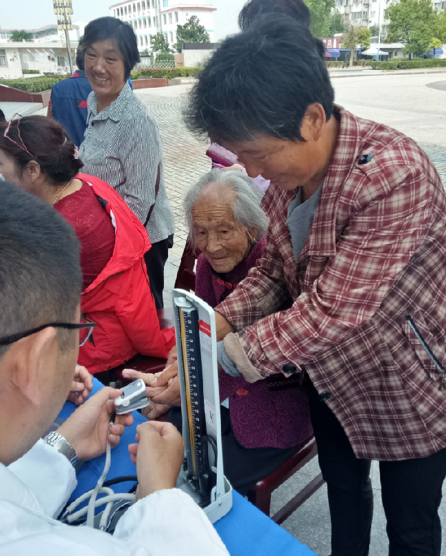 9月24日上午,淮海農(nóng)場醫(yī)院10多名醫(yī)護人員組成的2019年健康江蘇服務(wù)百姓大型義診活動,在淮海農(nóng)場文化廣場上拉開的帷幕。來自農(nóng)場社區(qū)群樂小區(qū)的百歲老人張瑞瑞在女兒的陪伴下,也趕到社區(qū)參加了當(dāng)天的義診活動。農(nóng)場醫(yī)院的兩名主任醫(yī)師對百歲老人進行測血糖、測血壓、心率和指脈氧測定等內(nèi)容,并詢問了老人平時的生活起居情況,老人的女兒還對與母親相關(guān)的疾病知識現(xiàn)場與醫(yī)生進行了咨詢溝通。