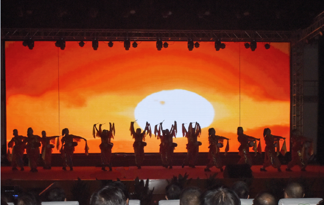 腰鼓《永唱中國夢》因為喜慶和熱烈的節目,特意被主辦方安排在臨海農場有限公司開場舞之后,四名主持人上臺主持走進江蘇農墾“壯麗七十載 奮進新時代”迎國慶文藝演出后的第一個表演的節目,16名參與節目演出的人員由精湛的舞姿、旺盛的精神魅力和富有激情的肢體語言,為整臺迎國慶文藝演出開了個好頭,彰顯了來自淮海文藝體育的風采。