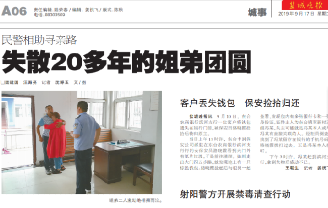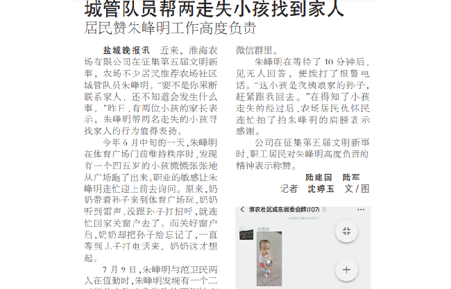 自淮海農場有限公司從今年7月份開展第五屆文明新事征集、評選以來,進一步激發了農場公司職工居民踐行文明新事,爭當淮海好人的氛圍。近來,我們從刊登鹽城晚報上獲悉,自9月份以來,已經有3篇反映淮海農場有限公司的職工居民做好人好事的文章,刊載在鹽城晚報上,這些文章分別是,9月10日:《城管隊員幫兩走失小孩找到家人》;9月15日:《民警相助尋親路 失散20多年的姐弟團聚》;9月25日:《輔警拾金不昧 錢包完璧歸趙》等三篇文章,彰顯了文明新事已經在淮海大地上蔚然成風。圖為刊登在鹽城晚報上這三篇好人好事報紙截圖及三篇報道稿。