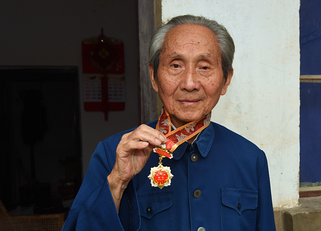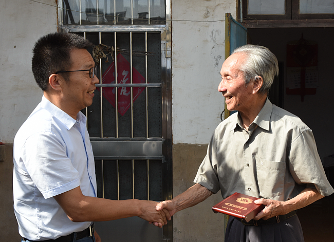 昨天下午,家住淮海農(nóng)場朝陽小區(qū)老干部樓95歲高齡的葉崇山老人,依然沉浸在新中國成立70周年的喜悅之中,因為前一天,淮海農(nóng)場有限公司黨委書記單祥忠特地來到葉老的家中,并向老人家遞交了“慶祝中華人民共和國成立70周年”紀(jì)念章。