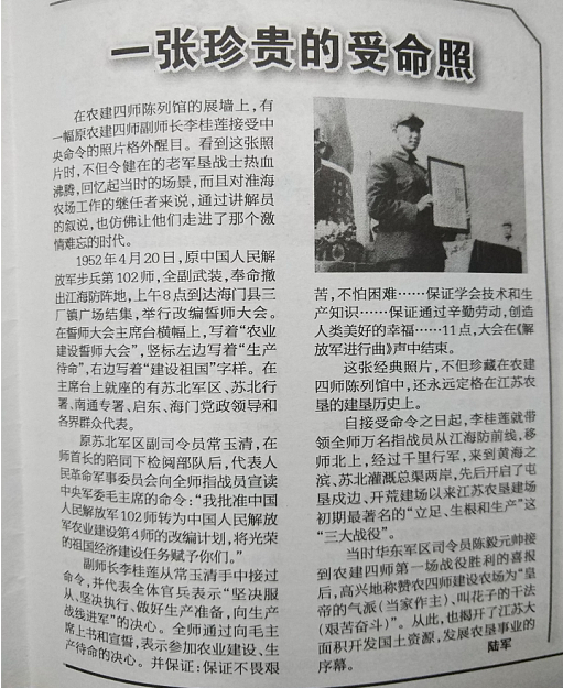 在10月8日出版的老年周報上,刊登了《一張珍貴的受命照》,展示了農建四師副師長李桂蓮在海門三廠鎮舉行的改編大會上,接受毛澤東命令時的鏡頭。全文刊登如下。