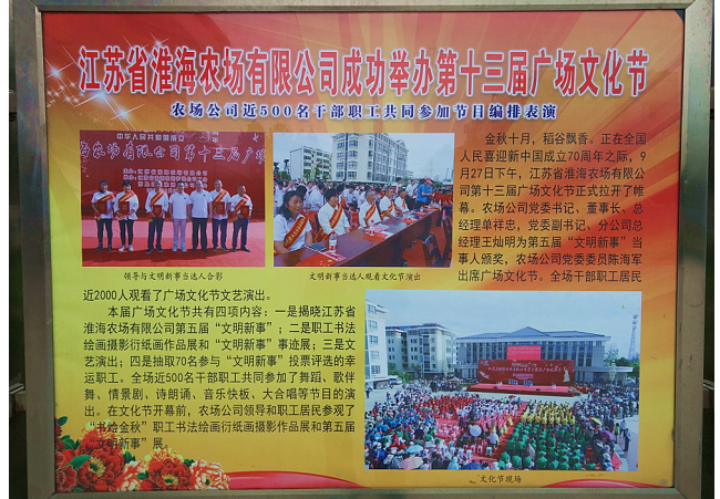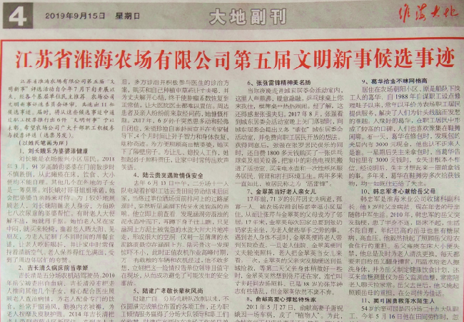 在集中推出文明新事宣傳的同時,淮海農(nóng)場有限公司文明辦在精神文明創(chuàng)建過程中,還要求各基層單位與創(chuàng)建同步,積極深入挖掘身邊孝老愛親、敬業(yè)奉獻、助人為樂、拾金不昧、見義勇為、誠實守信等方面的好人好事,對實時出現(xiàn)的“身邊好人”及時報送,通過農(nóng)場公司的《淮海大地》報、農(nóng)場門戶網(wǎng)、江蘇農(nóng)墾信息網(wǎng)和縣市報紙等媒體,及時宣傳,營造出“淮海好人”效應(yīng),用真情實意傳遞他們有血有肉的鮮活事例,給人們以力量和鼓舞。圖為淮海運用各種形式宣傳包裝文明新事典型。
