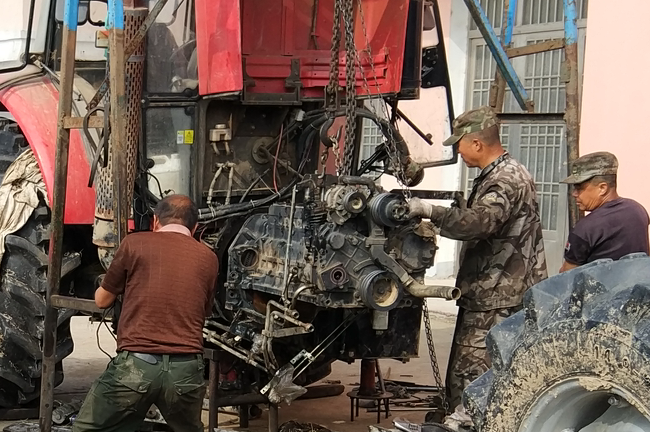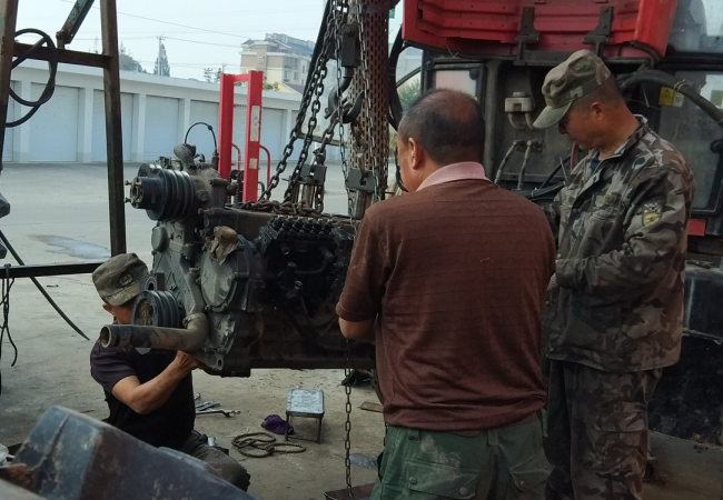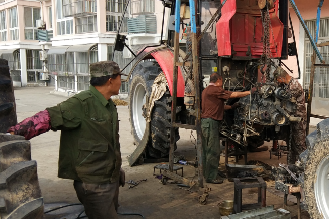 今年“三秋”開始以來,為保障農機更好地服務農業,該農機修理所以提供配件和搶抓修理為主業,既上門或到田間地頭進行搶修,又接受廣大農機戶上門修理農機業務,同時也無償地為廣大農機戶提供技術咨詢、電話醫生等服務,以站在農機戶的角度上思考問題,盡可能地縮短農機手等待農機配件或是修理的時間,千方百計并加班加點地為廣大農機戶提供方便。為節約時間,他們的中晚餐全交由快餐店來經營,夜晚更是加班加點地揮汗如雨搶趕進度。他們正是以誠信經營的理念和優質的服務質量,受到了農場有限公司及周邊廣大農機戶的支持和歡迎。圖為李貴等四兄弟在搶修農機時的鏡頭。