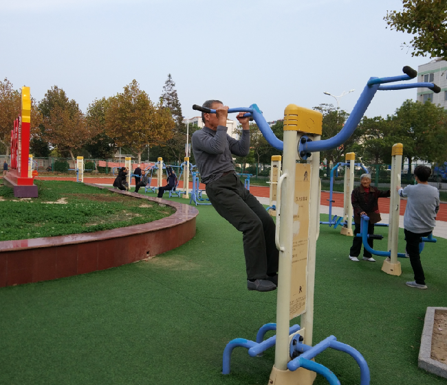 淮海農場職工休閑體育運動廣場的健身器材上,一位頭發花白的老人雙手拉著雙杠,頭朝下腿朝上,雙腿緩慢上抬,直到伸直為止,一個固定的動作能撐上幾分鐘。該老人名叫周少彪,今年88歲,他是江蘇射陽縣淮海農場社區城南居委會的居民,這是筆者看到的情景。不僅如此,已經88歲高齡的他就地撐上十幾個仰臥撐在塑膠跑道上進行雙腿交叉跑等高難度動作,身體柔軟程度令人驚嘆。