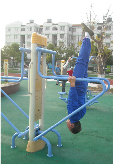 在淮海農場職工休閑體育運動廣場的健身器材上,一位頭發花白的老人雙手拉著雙杠,頭朝下腿朝上,雙腿緩慢上抬,直到伸直為止,一個固定的動作能撐上幾分鐘。該老人名叫周少彪,今年88歲,他是江蘇射陽縣淮海農場社區城南居委會的居民,這是筆者看到的情景。不僅如此,已經88歲高齡的他,還就地撐上十幾個仰臥撐、在塑膠跑道上進行雙腿交叉跑等高難度動作,其身體的柔軟程度令人驚嘆。