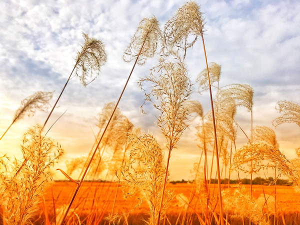 當(dāng)收割機(jī)的出糧筒將顆顆鼓鼓的稻粒往卡車(chē)?yán)镄稌r(shí),我忍不住迎著漫天紛飛的稻葉屑按下快門(mén),拍下這令人興奮的瞬間,任稻葉屑刺痛我的臉頰,吹的我睜不開(kāi)眼,可我卻十分喜歡這種感覺(jué),享受這個(gè)過(guò)程,這種境界,好似這大片的金黃只屬于我,我特別喜歡這景色,美的讓人無(wú)法用文字來(lái)表達(dá),穿過(guò)一片片稻田,和不時(shí)從身邊經(jīng)過(guò)的農(nóng)業(yè)職工打招呼,他們都會(huì)對(duì)我說(shuō),下來(lái)采風(fēng)的啊,今年可要好好拍拍噢,我笑著應(yīng)答,那是必須的,我能感覺(jué)到他們內(nèi)心的喜悅,一年的辛勤耕耘和付出,能有如此的回報(bào)是他們?cè)傩奈坎贿^(guò)的了,我替他們高興,更為他們今年的收獲而歡欣。田邊路兩旁的蘆葦今年長(zhǎng)的也是特別的好看,飄蕩在半空中,與遠(yuǎn)處的一片金黃形成了鮮明的色差,將稻田映襯的金碧輝煌般如同灑滿(mǎn)了一地的黃金,好久沒(méi)有看到如此令人興奮的景色。