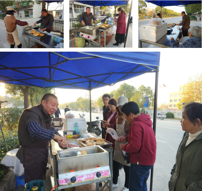 我們在現場注意到,徐素軍夫婦非常注意食品的衛生清潔工作,攤位上并沒有專門放置油餅的器皿,所有的食品全用器械操作,令購買的人感覺很是衛生,進一步激發了購買欲望。據了解,在農場制作油餅的有好幾家,而徐素軍他與別人不同的是,他一反常態地把油餅定在下午賣,成為了人們午后消食的唯一攤點,這更為他的油餅攤增添了人氣。