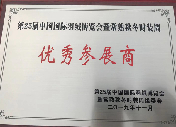 11月18日,江蘇新洋美爾姿服飾有限公司榮獲第25屆中國國際羽絨博覽會暨常熟秋冬時裝周“優秀參展商”稱號。