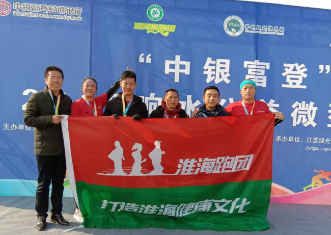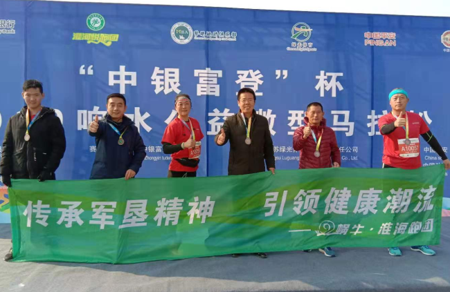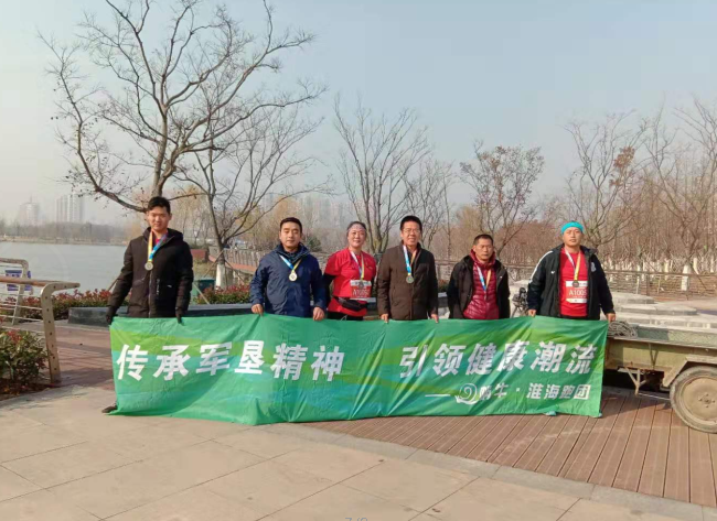 在12月8日舉辦的“中銀富登”杯2019年響水公益微型馬拉松賽事上,來自淮海農場有限公司的田德俊、高善文、李成軍、辛道紅、陳紅新、劉迎春等6名男女選手,與主辦方共300名選手一起,報名參加了在東鳴湖公園舉辦的10公里馬拉松比賽的賽事,其中淮海跑團選手田德俊、高善文兩名選手還以較好的成績,先后一起跑進了10公里馬拉松比賽賽事的第十二、三名。圖為馬拉松賽事結束后,來自淮海跑團的六名選手即興在一起與“傳承軍墾精神 引領健康潮流”宣傳橫幅進行合影時的鏡頭。