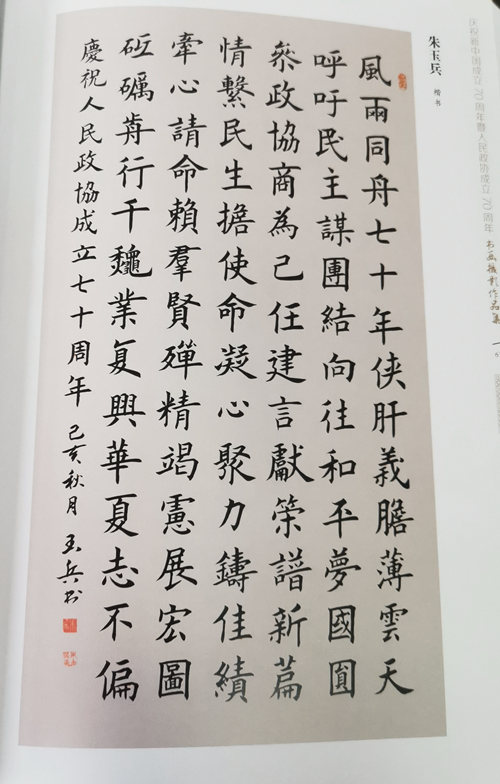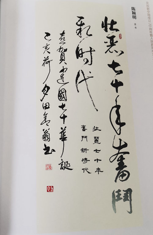 陳穎明的草書《壯麗七十年 奮斗新時代》、陳蘭的草書《祖國萬歲》、朱玉兵的楷書《風雨同舟七十年》以及張秀亭的畫作《長城雄風》、趙文謹的畫作《碩果滿園》均得到了高度評價,成功入選書畫攝影作品集。