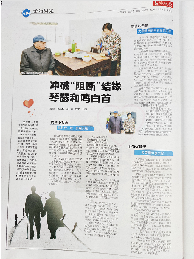 在今月1月5日出版的鹽城晚報新開辟的《老爸老好》欄目上,以整版的篇幅刊登了農場公司通訊員陸軍和鹽城晚報記者共同采寫的一則《沖破“阻斷”結緣 琴瑟和鳴白首》的文章,記錄了在58年前,一個高大帥氣的小伙子,對一個比他小8歲的姑娘展開愛情攻勢。同連隊另3個姑娘,也對這個帥哥上心,便編織謊言來“阻斷”他們相戀。她信以為真,退掉了定情物。而他則坦言:“只要她不嫁,我就一直等著她。”這對男女就是江蘇農墾淮海農場城西居委會現年83歲的顧兵和75歲的陳秀蘭夫婦,是愛和情緣讓他們牽手同舟共濟走過了半個多世紀。