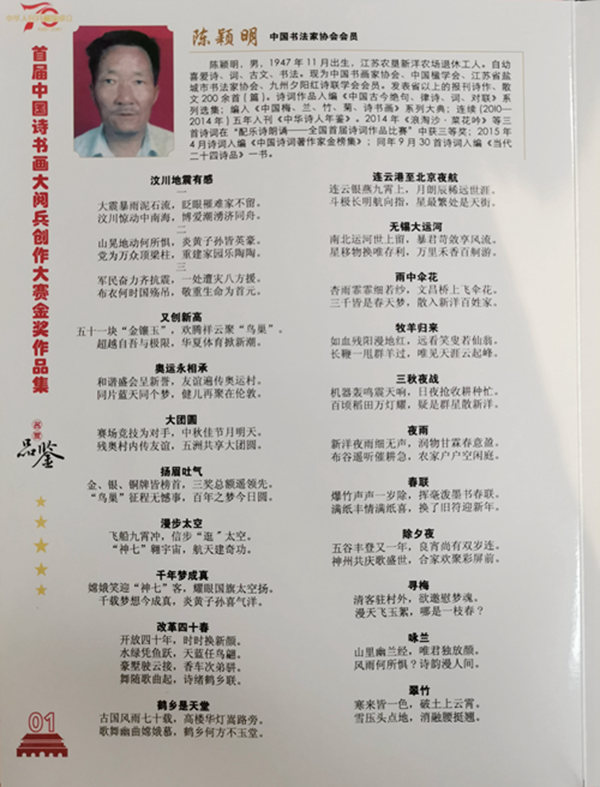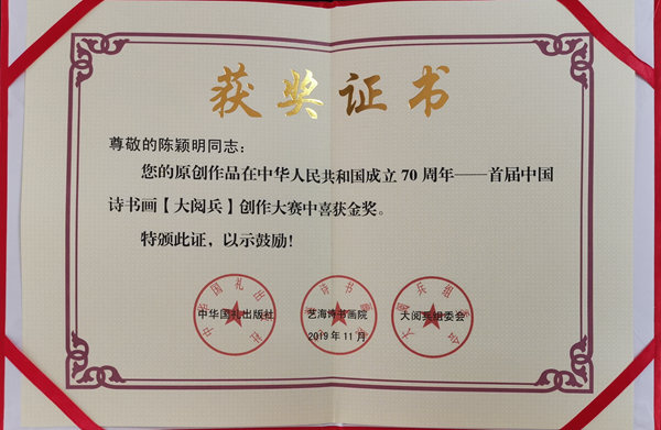 近日獲悉,新洋退休職工陳穎明的原創詩詞作品在中華人民共和國成立70周年——首屆中國詩書畫【大閱兵】創作大賽中喜獲金獎。