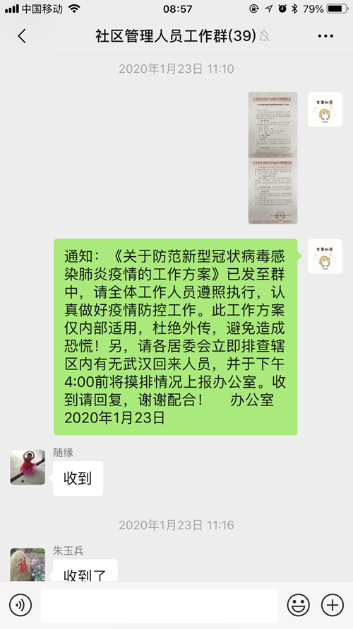 特別是,一接到上級大數據排查出來跟疫區有關的人員信息后,居委會就要第一時間上門進行情況核實,登記信息,測量體溫……。你問他們怕不怕,抗“疫”一線的城中居委會主任朱玉兵發在微信群里的一席話讓所有一線工作人員心生共鳴。他說,“不是我們社區人不怕死,是責任讓我們無法回避;不是我們社區人不害怕,是使命讓我們勇敢前行;不是我們社區人沒有家庭,是擔當讓我們顧大家舍小家。戰斗在防疫一線的不止只有醫護人員,我們社區人也是逆行者,是真正的守護者,在防護物資緊缺的情況下,我們走街串巷入戶調查,在監護居家隔離時,我們每天堅守。惟愿家鄉人民幸福安康。”是的,哪有什么歲月靜好,只不過有人替你負重前行,給逆行英雄們點贊!