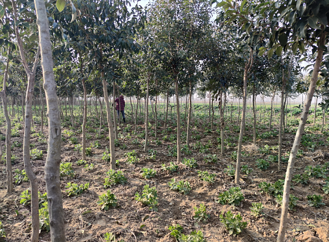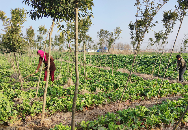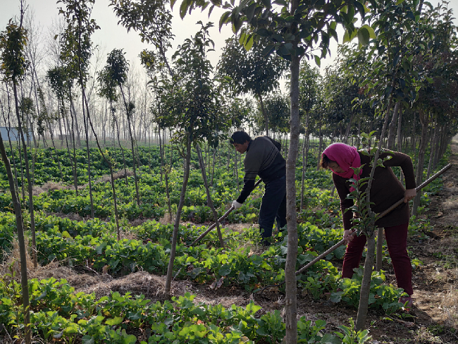 淮海農場境內有面積較大的林地面積,并且苗木長勢較好,成為農場生態林地發展的一景。林木的發展,利益于農場采取的集體林、股份林和承租林三種管理模式,因股份林和承租林一般由職工管理的林下經濟發展的較好外,昨天下午,我們來到農場五分場社區集體管護的林地間看到,其林下林邊的油菜、蠶豆等矮桿農作物長勢正旺,農業職工正在林下進行鋤草等農事活動,給這個新春增添了一道忙碌的風景。