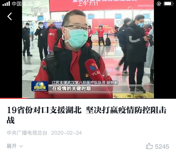 “截至今天,江蘇已派出13批2800多醫護人員援助湖北,來自鹽城射陽縣人民醫院的胡明朝,老家是湖北孝感,疫情發生后,他堅持報名回家鄉支援。”新聞中對胡明朝支援湖北家鄉的事跡進行了報道。