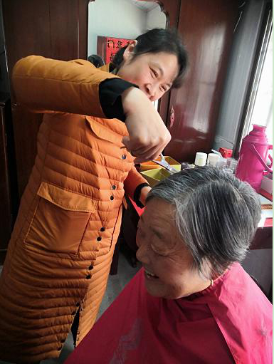 自新型冠狀病毒肺炎感染的疫情爆發(fā)以來,淮海農(nóng)場職工、城西居委會志愿者沈月萍了解到振興小區(qū)有好幾個老年人無法外出理發(fā)或是擔(dān)心與外界親密接觸引起的心理恐慌等問題,于是她利用自己懂理發(fā)技藝這一潛質(zhì),應(yīng)城西居委會幾位老人的要求,帶著理發(fā)工具,逐門逐戶地親自上門為老年人修剪頭發(fā),其親切的服務(wù)態(tài)度,免費為老人服務(wù)的鏡頭,贏得了城西居民們的普遍贊譽(yù)!圖為志愿者沈月萍正為老人凌愛珍修剪頭發(fā)時的鏡頭。