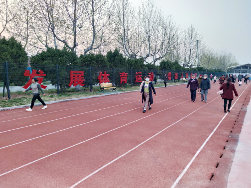 農(nóng)場(chǎng)社區(qū)體育運(yùn)動(dòng)廣場(chǎng)上不僅有6-8跑道的塑膠跑道,更有籃球場(chǎng)、舞蹈池、門(mén)球場(chǎng)和眾多的健身器材,這里成為職工居民人氣最旺盛的公共場(chǎng)所。圖為農(nóng)場(chǎng)社區(qū)的職工居民從剛制作成的“發(fā)展體育運(yùn)動(dòng) 增強(qiáng)人民體質(zhì)”的體育標(biāo)語(yǔ)前走過(guò)。