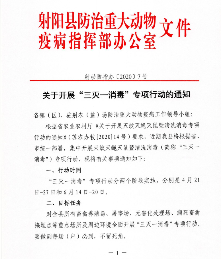 此次專項行動分別于4月22—28日和6月15—21日兩個時間段,集中開展清洗消毒突擊周行動及重大動物疫病春防、夏防工作。據統計,農場共有大型養殖場2家,個人家庭小型養殖戶11戶,目前動防辦正在積極對接,做好宣傳發動工作,努力營造社會各方支持配合的良好氛圍,確保“三滅一消毒”專項行動取得實效。