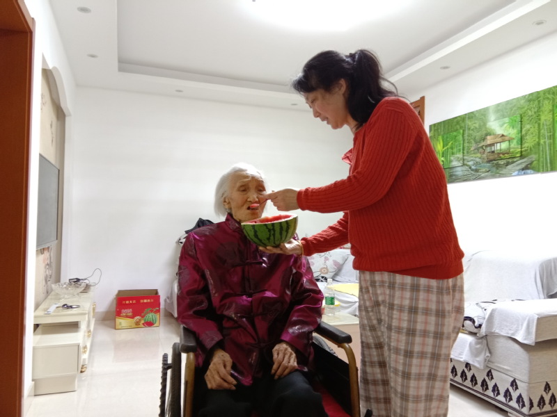 透過照片的鏡頭,雖然我們沒有到現場,但我們大家分明看到了一副溫馨的生活場景。作為女兒,不但在母親床的一側又置放了一張床,經常與母親聊著,隨時知曉母親的情況,還在生活中更是無微不至地照顧著老母親。你望,老人的床上是清清爽爽,仿佛聞到了散發著太陽的溫暖,絲毫沒有無人照顧的雜亂;你看,為了母親,周粉英為老母梳頭、推著輪椅散步、喂母親吃甜甜的西瓜;你瞧,女兒為了母親,為她喂好每一口飯,為她勤換衣服,讓母親干干凈凈地過好每一天。