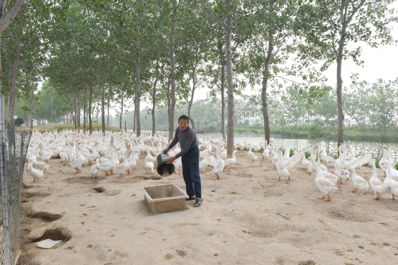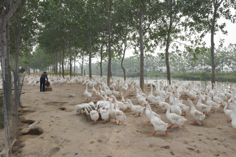 據了解,這是該分場社區十六大隊職工卞元如去年在5月底前,通過林下堆堤河道的資源優勢,吸引了家中有炕坊的合伙人前來投資30多萬元,一起發展林下養殖經濟。目前,他們通過繁育1200只三花鵝,走林下三花鵝養殖、種蛋繁育、幼鵝銷售等相連接的產業鏈,不僅促進的林木的生長,也產生了較好的經濟疊加效益。圖為林下的三花鵝及飼養員給鵝投料時的鏡頭。