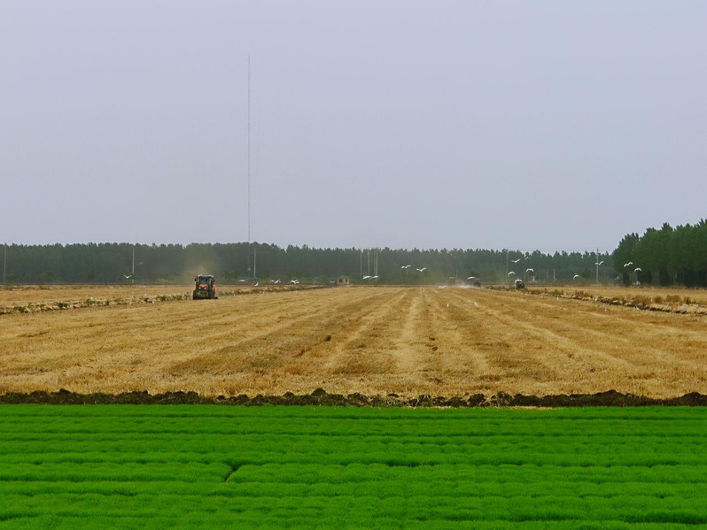 每年的芒種,都是農事最繁忙的時期,黃與綠是農田里的主色調,恰逢一行白鷺飛上青天,黃、綠、白三色相得益彰,繪就了一幅風景宜人的生態畫卷。這時如果不是田埂上忙碌著的收割機提醒了你,你會忘記了這其實是在居民生活區,人與自然本就該和諧相處。