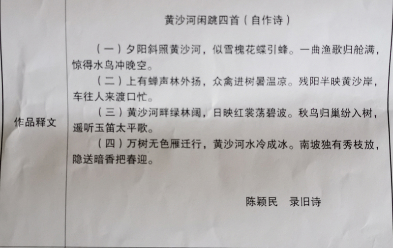 近日,新洋資深書畫愛好者陳穎明的一副詩書作品《黃沙河閑跳四首》,生動描繪了北枕黃沙河的新洋農場生態(tài)秀麗的迷人風貌。