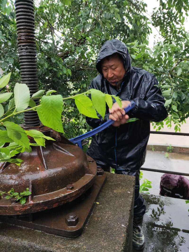 農水中心主任何成就帶領農機總站一行7人臨危受命冒雨前往小木閘。小木閘是農場剛建成時建立的河閘,肩負新洋農場的抗洪排澇任務幾十年,在農場新建成電動河閘后處于退休狀態,原本的電機已經拆除,升降閘門的螺桿也已生銹。如果不是這次雨來的太猛,小木閘本可以如一個退休的老人一樣靜靜地看著新洋蓬勃發展。