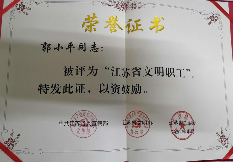 日前,中共江蘇省委宣傳部、江蘇省文明辦、江蘇省總工會聯合發文命名“江蘇省十佳抗疫職工”、第十七屆“江蘇省十佳文明職工”和“江蘇省文明職工”,新洋農場有限公司水電管理服務中心主任郭小平獲評“江蘇省文明職工”榮譽稱號。多年來,郭小平積極踐行社會主義核心價值觀,是愛崗敬業、技能精湛、品德高尚、遵章守紀的先進職工典型代表。